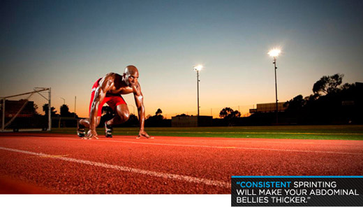 Sprints are a great abs exercise: Every time you lift your leg in the air, you work your abs. When you run, your abs have to work at a fast rate. Consistent sprinting will make your abdominal bellies thicker. I attribute my thick ab bellies to my many years of competitive sprinting.