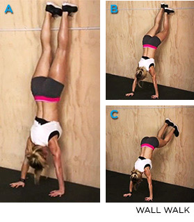 Start in the push-up position with your toes touching a wall. Climb up the wall using your feet and pushing with your shoulders. You should end up in a handstand with your body a few inches away from the wall.