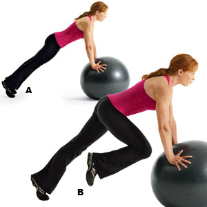Get in plank position with your hands shoulder-width apart on a stability ball (A). Draw your right knee toward your chest (B). Hold for 1 second, then return to plank position. That's 1 rep.