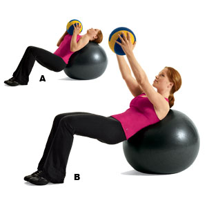 Grab a 5- to 10-pound medicine ball. Lie faceup on a stability ball with back and head pressed into the ball, your feet together on the floor, and the medicine ball positioned against your chest (A). Brace your abs and crunch up until your shoulders are off the ball. Then reach the ball toward the ceiling (B). That's 1 rep.