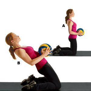 Grab a 5- to 10-pound medicine ball and kneel on the floor with your knees hip-width apart. Lengthen your spine and press the ball against your abs (A). Slowly lean back as far as possible, keeping your knees planted (B). Hold the reclined position for 3 seconds, then use your core to slowly come up to the starting position. That's 1 rep.