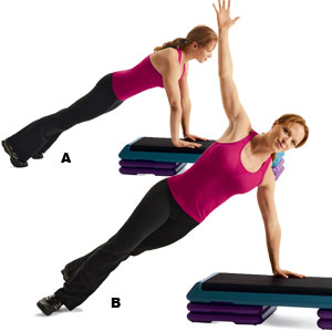 Get in plank position with your hands on a 12- to 18-inch step (A). With your weight on your left arm, rotate your body while raising your right arm toward the ceiling (B). Return to plank position and step your right arm down to the right of the bench, then your left arm down to the left of the bench. Step back up, leading with your left arm. That's 1 rep.
